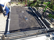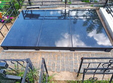 Укрываем внутреннюю зону участка геотекстилем и приносим три массивные прямоугольные плиты, которые в дальнейшем послужат наземным покрытием могилы.